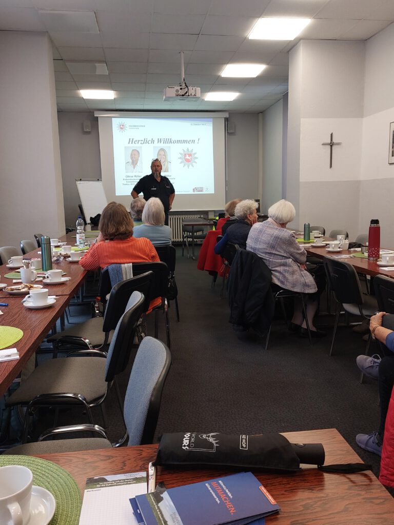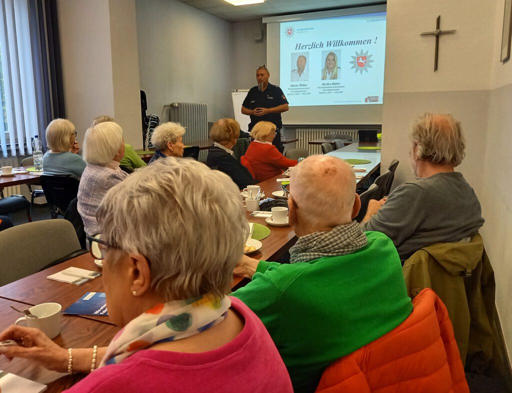 Am 21.10.2025 hatten wir den Polizeioberkommissar Ritter zu Gast. Er ist Kontaktbeamter in einem Hannoverschen Gebiet und informierte uns über das richtige Verhalten bei betrügerischen Anrufen, beim Geldabheben und auch beim richtigen Umgang mit Personen, die angeblich Hilfe auf dem Gehweg oder an der Haustür suchen oder sich als vermeintliche Handwerker ausgeben. Gerade Senioren sind hier eine Zielgruppe für Kriminelle. Von den anwesenden Mitgliedern und Gästen kamen zahlreiche Fragen zu realen Situationen, Herr Ritter ergänzte seinen Vortrag mit aktuellen Fallbeispielen aus Hannover.